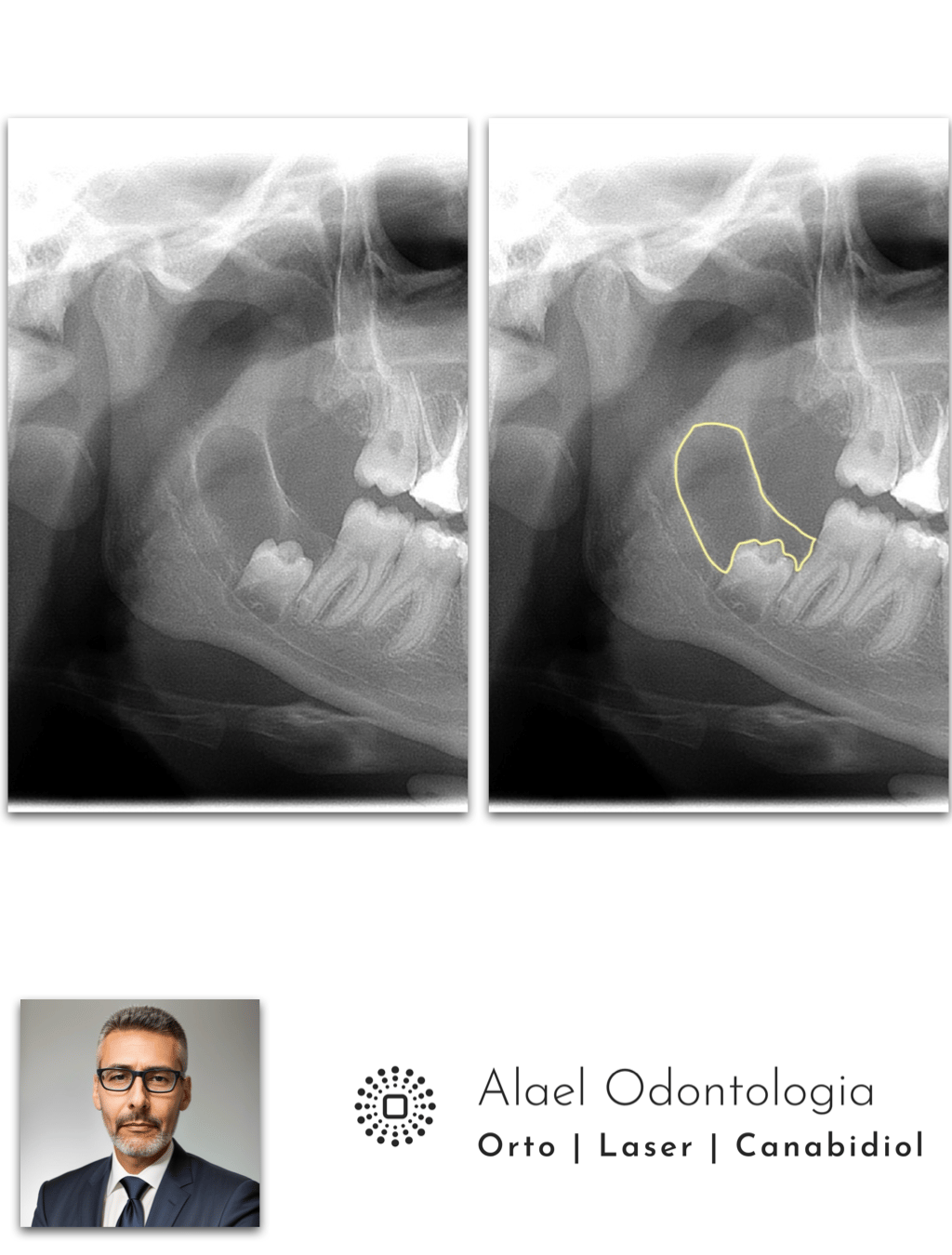 Os cistos odontogênicos representam um grupo heterogêneo de lesões de origem epitelial que acometem os maxilares, sendo o cisto dentígero o segundo mais frequente, depois do cisto radicular. A maioria está relacionada à coroa de dentes inclusos, principalmente terceiros molares inferiores. O reconhecimento radiográfico precoce é fundamental para evitar complicações como reabsorção radicular, fratura patológica ou transformação neoplásica¹–³.